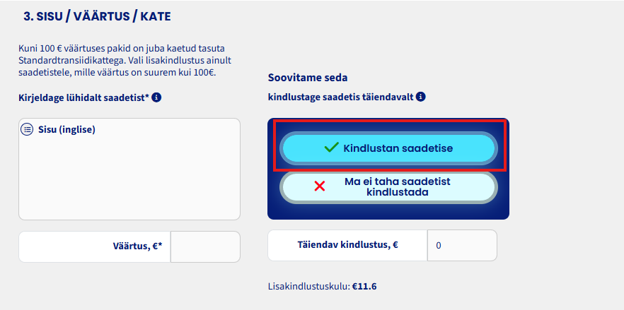 Kui olete valinud soovitud teenuse, täitke saatja ja saaja andmed. Kolmandas etapis kirjeldage oma saadetise sisu inglise keeles ja märkige selle väärtus. Siin näete ka meie soovitust — valida täiendav kaitse (vt allolevat pilti). Just siin saate märkida kindlustussumma ja tellida täiendava kindlustuse, mis tagab meelerahu teie väärtusliku saadetise teekonnal.